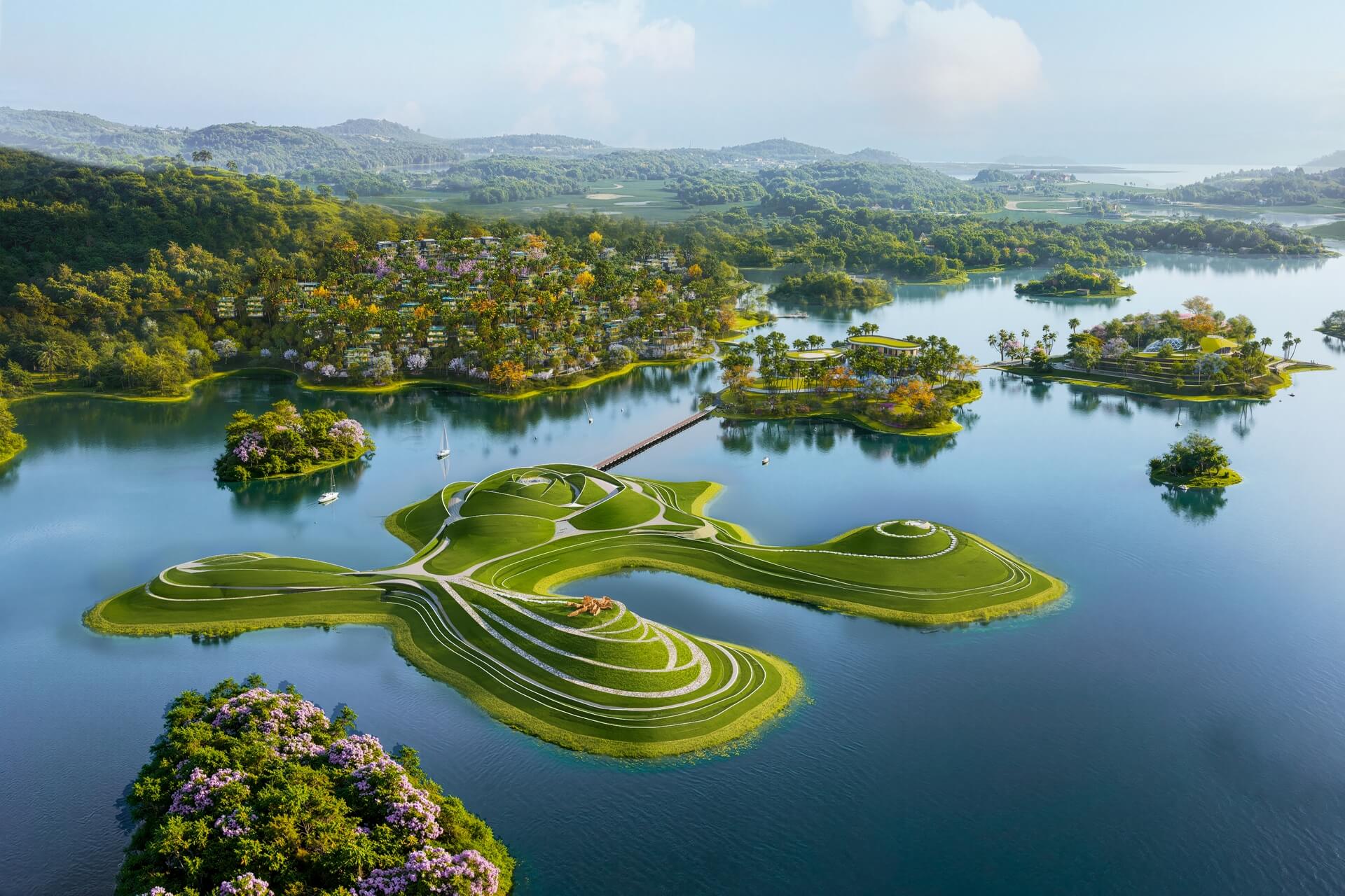 Đặc biệt, dự án tiên phong mô hình “đảo nghệ thuật ngoài trời” tại Đông Nam Á. Toàn bộ không gian hồ – rừng – núi – đảo được kiến tạo như một bảo tàng mở sống động, nơi nghệ thuật đối thoại với thiên nhiên nguyên sơ qua mô hình land art mang hình dáng hoa trà đang nở rộ giữa lòng hồ cùng các tác phẩm điêu khắc đương đại quy mô lớn. Cách tiếp cận này không chỉ tạo nên sức hút dài hạn, mà còn mở ra lợi thế khai thác linh hoạt, gia tăng khả năng thu hút truyền thông tự nhiên và dòng khách thượng lưu ổn định quanh năm, ngay cả trong bối cảnh thị trường nhiều biến động.
